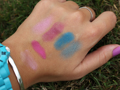 The eyeshadows are nicely pigmented too (see below for a selection of swatches including the two lip colours on the left)