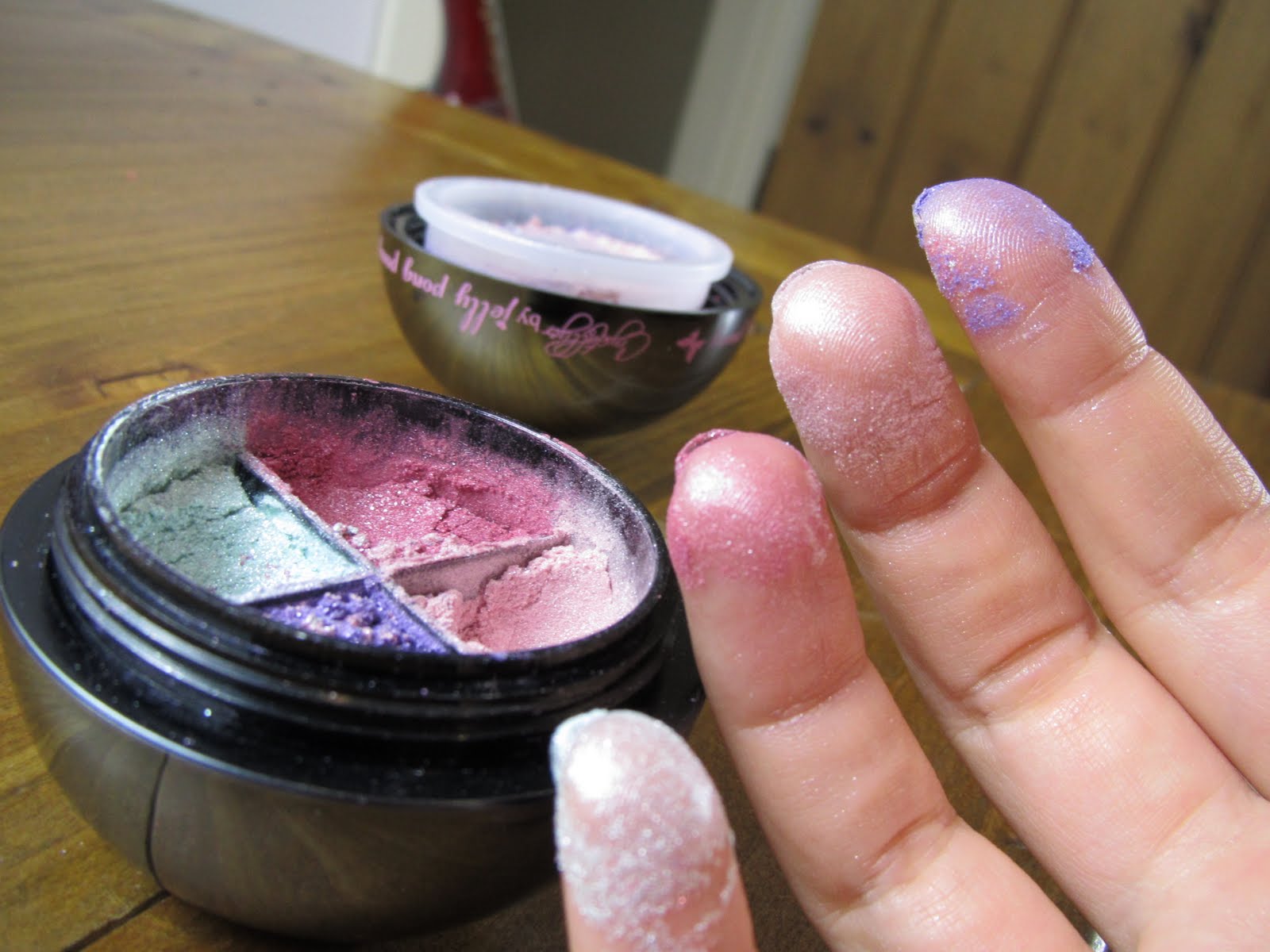 They create a pretty lilac/pink colour when all mixed together and this colour dusted on the skin leaves a gorgeous iridescent pink sheen that is perfect for parties and reminds me of being ten again (but slightly more subtle this time!)