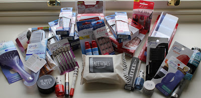 The prize consists of (hold your breath…) Topshop… Face Wipes, Nail Varnish Remover, Brighten pen in Moonlight, Balm in Sheen, Kohl in Saddle, Lip Stick in Rapturous, Liquid Liner in Infinite, Nail Varnishes in Airplane and In The Red Goody… 4 Jumbo Self-Holding Rollers, 17 Gentle Pontytailers, 3 Stayput Headbands, 6 Sectioning Clips, 48 Black Bobbies, 1 Gelous Grip Curling Brush, 1 Ouchless Conditioning Comb, 1 Ouchless Brush, 1 Multi Purpose Comb Set (contains 6 combs) Kiss/Broadway… 1 Jet Dry Nail Glue Duo, 1 Set of Flexibilbe Nail Art Stickers, 1 Paint and Stencil Kit (black, white & silver glitter nail art pens, plus stencils), 5 sets of Fashion Express Broadway Nails (various designs), 4 sets of Fashion Dive Broadway Nails (various designs), 2 sets of Kiss Everlasting French Nails, 1 All or One Aritifical Nail Remover
