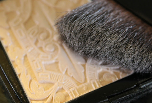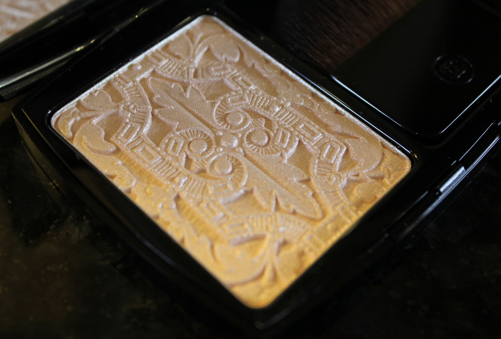 The intricate design carved into the powder was apparently inspired by a belt buckle worn my Coco Chanel in the 1930’s. It reminds me of Aztec design and it’s simply stunning in the pan.