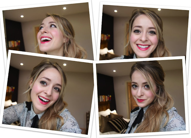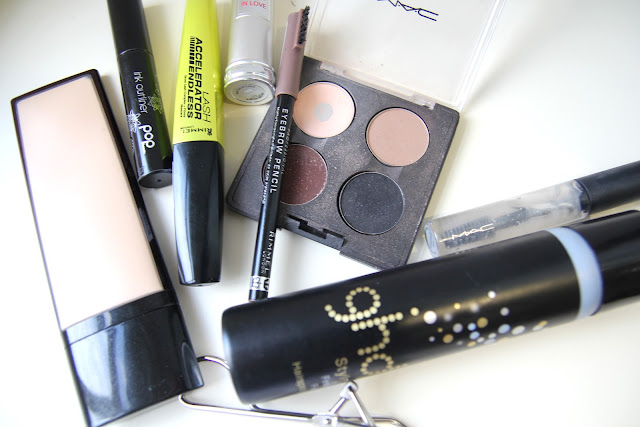 Products Used – Clockwise from left: Kevyn Aucoin Sensual Skin Balm, Pop Beauty Ink Outliner, Rimmel Lash Accelerator Endless Mascara, Lancome Rouge in Love Lipstick in 159B, Rimmel Eyebrow Pencil in Hazel, MAC Eyeshadows in Orb, Wedge, Espresso & Carbon, Mac Brow Set, GHD Hairspray, RMK Eyelash Curlers.