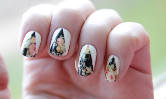 With a combination of mint green, geometric design and floral print, you couldn’t get a more perfect nail look for Spring.