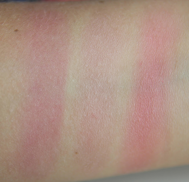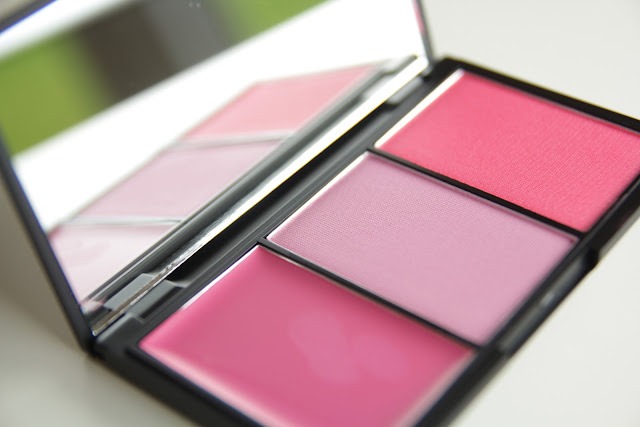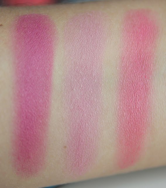 one beautiful rosy cream blush and two powders, one lilac toned with a matte