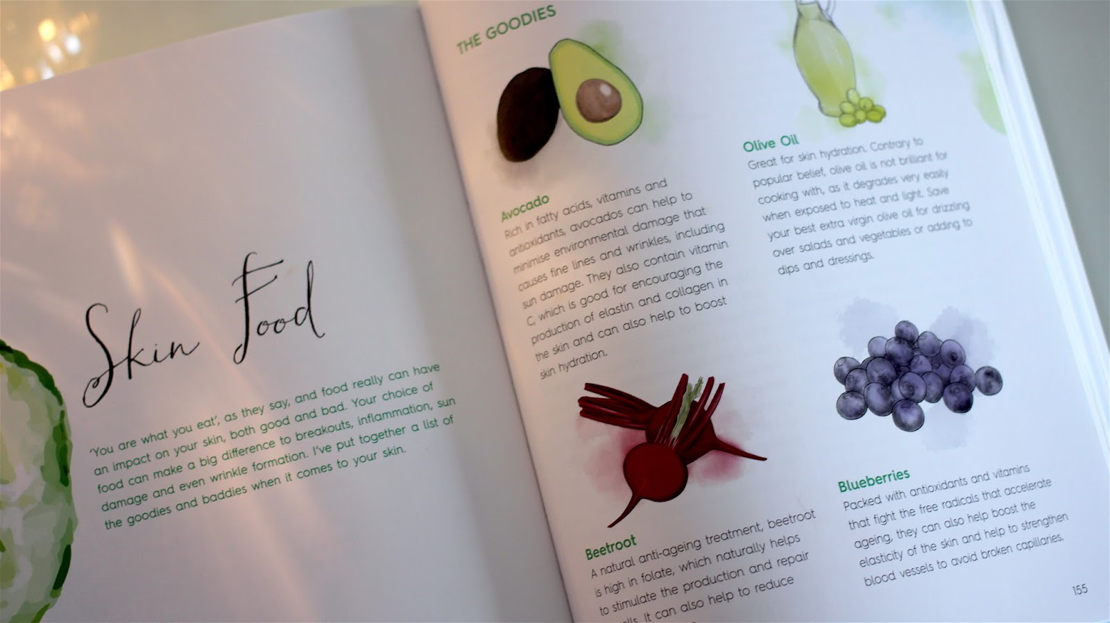 Water isn’t the only dietary change you can make that has a beneficial effect on your skin though. What you eat can have a direct effect on how your skin is looking. I actually wrote a chapter about this in my book, and I’ve included pictures of the relevant pages below, but to pick out some of my favourites… Avocado is amazing for the skin it is packed with vitamins, minerals and healthy oils that can help boost your complexion. Oily fish like salmon works in a similar way. The omega-3 fatty acids in fish oils help to delay ageing and help protect your skin against free radicals. Blueberries are also packed with antioxidants, so are great for your skin (and they’re yummy too!)